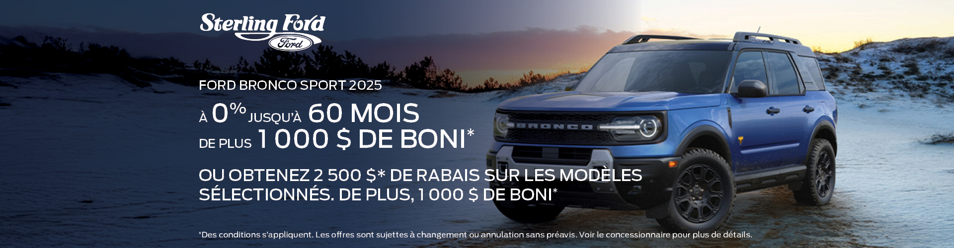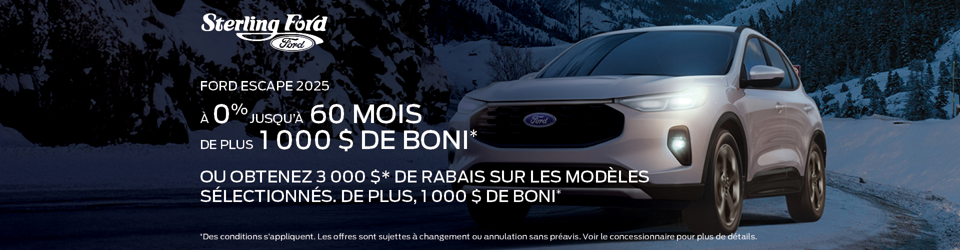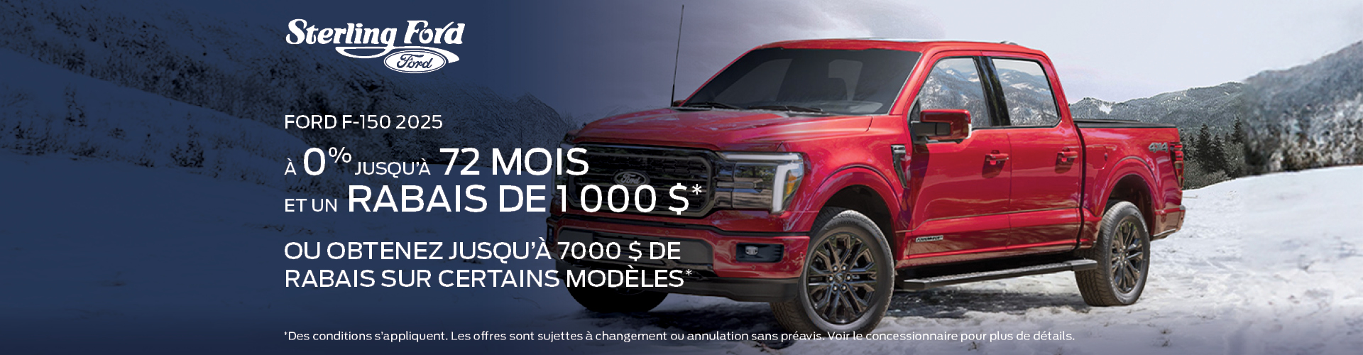 Vous recherchez un concessionnaire Ford amical, compétent et bilingue, spécialisé dans les voitures, camions et VUS Ford neufs et d’occasion à Ottawa et dans les environs tels qu’Orléans, Gatineau, Hull et Kanata ? Sterling Ford est votre destination idéale. Avec le plus grand choix de véhicules Ford neufs à Ottawa, nous sommes fiers d’offrir un service client exceptionnel. Que vous recherchiez un nouveau Ford F-150, Bronco, Escape, Mach-e, Lightning, Transit, Mustang, Edge ou Explorer, nous avons le véhicule parfait pour répondre à vos besoins, avec une large sélection des derniers modèles et style Ford. Visitez notre salle de montre dès aujourd’hui et découvrez la différence Sterling Ford — où votre prochain Ford vous attend !