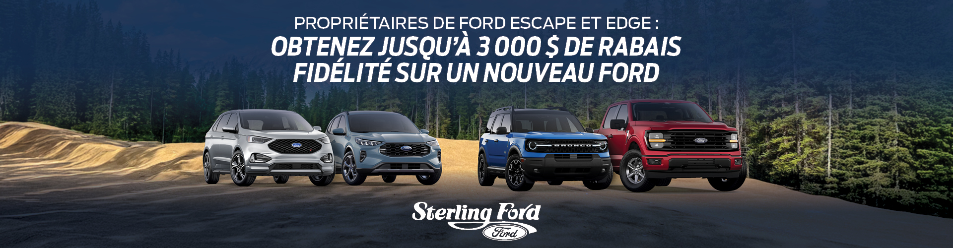 Vous recherchez un concessionnaire Ford amical, compétent et bilingue, spécialisé dans les voitures, camions et VUS Ford neufs et d’occasion à Ottawa et dans les environs tels qu’Orléans, Gatineau, Hull et Kanata ? Sterling Ford est votre destination idéale. Avec le plus grand choix de véhicules Ford neufs à Ottawa, nous sommes fiers d’offrir un service client exceptionnel. Que vous recherchiez un nouveau Ford F-150, Bronco, Escape, Mach-e, Lightning, Transit, Mustang, Edge ou Explorer, nous avons le véhicule parfait pour répondre à vos besoins, avec une large sélection des derniers modèles et style Ford. Visitez notre salle de montre dès aujourd’hui et découvrez la différence Sterling Ford — où votre prochain Ford vous attend !
