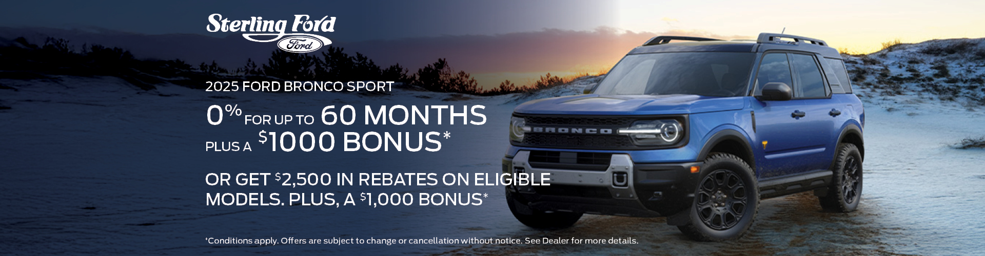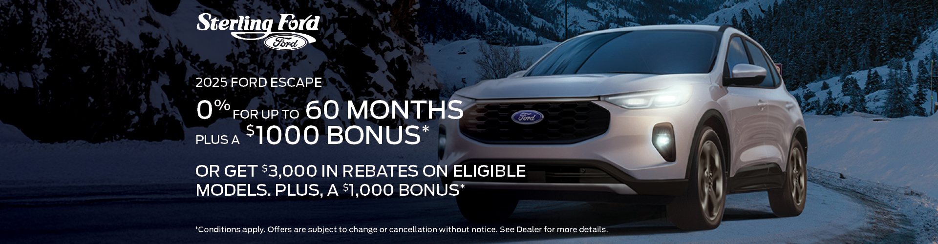 Take advantage of exceptional promotions at Sterling Ford, your trusted Ford dealership in Ottawa! Discover incredible discounts on a selection of new and pre-owned vehicles, including popular models like the Ford F-150, Escape, Bronco, Explorer, Edge, Mustang, Mach-e, Transit, Lightning and much more. This is the perfect time to drive a quality Ford vehicle while making significant savings. Visit Sterling Ford in Ottawa, near Gatineau, Kanata, and Orleans, and enjoy exclusive offers waiting for you! Find the vehicle that meets your needs while taking advantage of our limited-time promotions.